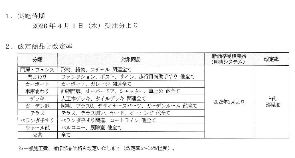 27Nov2025 2026年4月LIXIL製品の値上げのお知らせ 2026年4月1日にLIXIL製品の価格改定が発表になりました。 門扉・カーポート・デッキ・ガーデンルームなどエクステリアもほぼ全ての商品が5%程度値上げになるようです。 値上げ直前には駆け込みで工事等の混雑が予想されますのでリフォームをご検討中の方はお早めにご相談ください。 Tweet Share +1 Hatena ビームスデザインモデルのおしゃれな物置セール開催中 最近のお知らせ一覧お知らせ一覧 ビームスデザインモデルのおしゃれな物置セール開催中 2025.11.01 三協アルミスカイリードが安い!定価から59%OFF! 2025.11.01 イベント開催|名古屋Office 2025.09.10 本格門松の予約販売について|扶桑展示場・名古屋Office 2025.09.09 おしゃれなガーデンルーム・テラス・ウッドデッキ・カーポート・フェンスのリフォームご検討中の方へ 2025.09.01