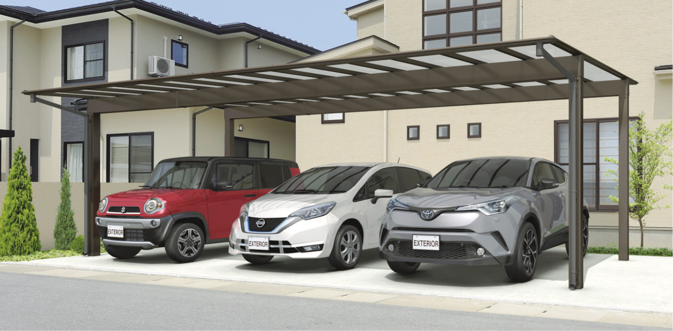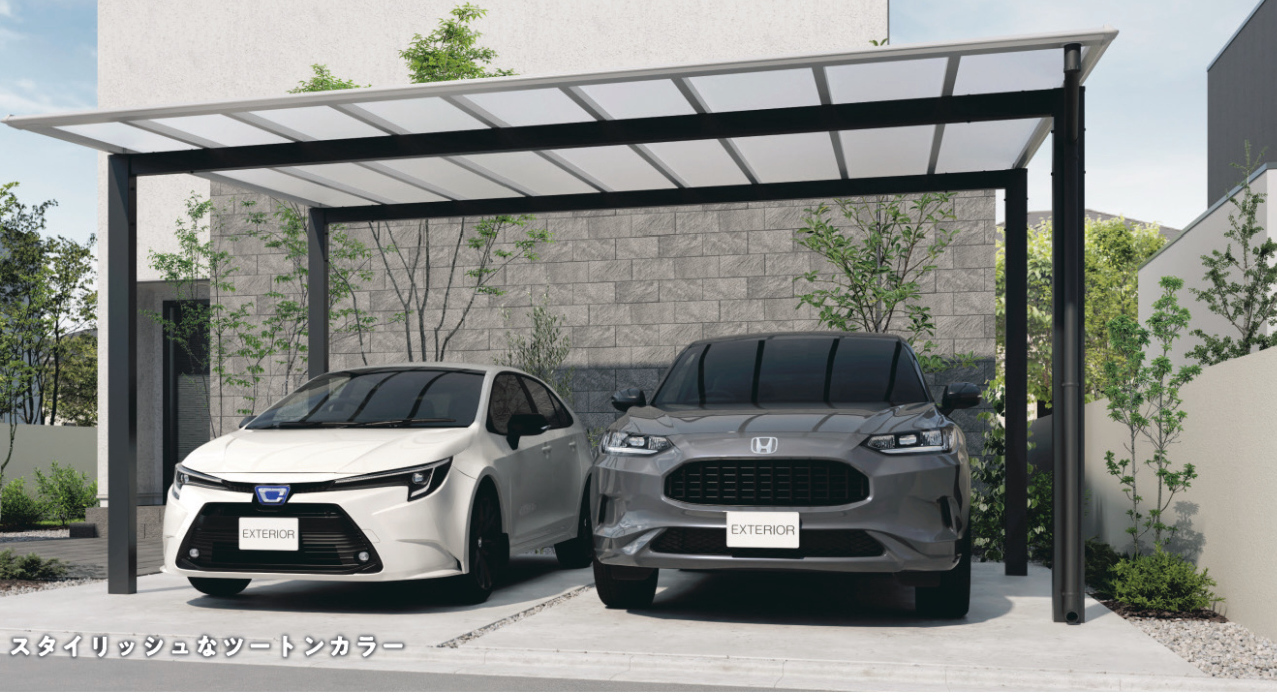 屋根に中桟を持たない新構造がカースペースに明るく軽快なイメージを生み出すカーポート。
