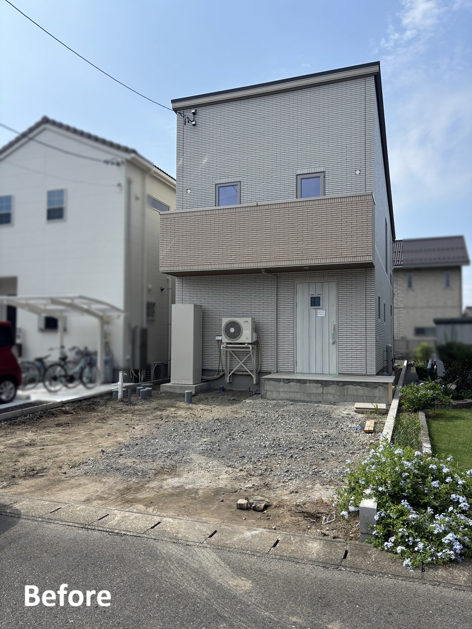 白とベージュを基調とした建物に合わせ、ナチュラルで可愛らしい外構をつくりました。