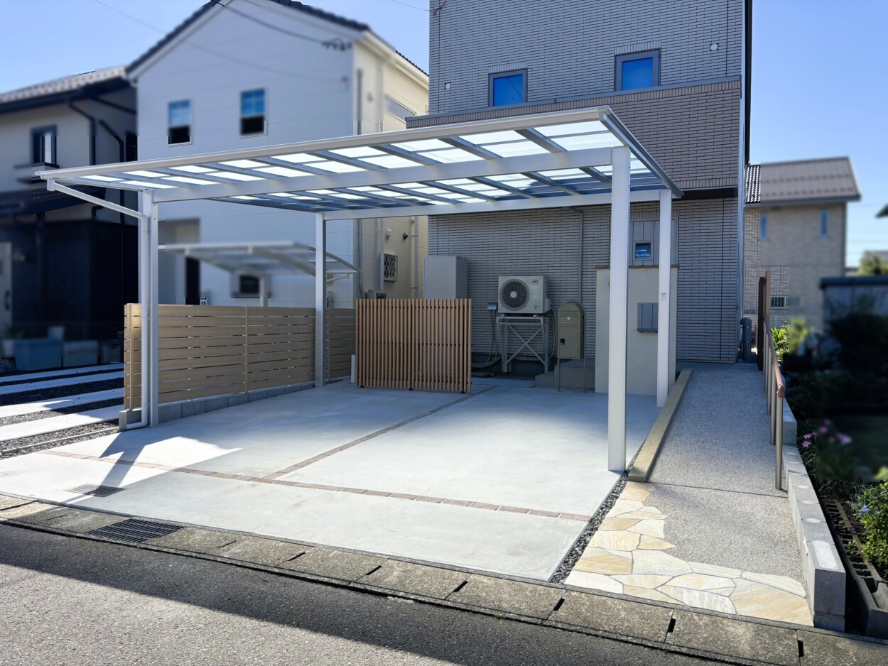 2台用カーポート, スロープ, 一条工務店, 手すり, 本店, 植栽, 樹脂フェンス, 物置, 目隠しフェンス, 立水栓