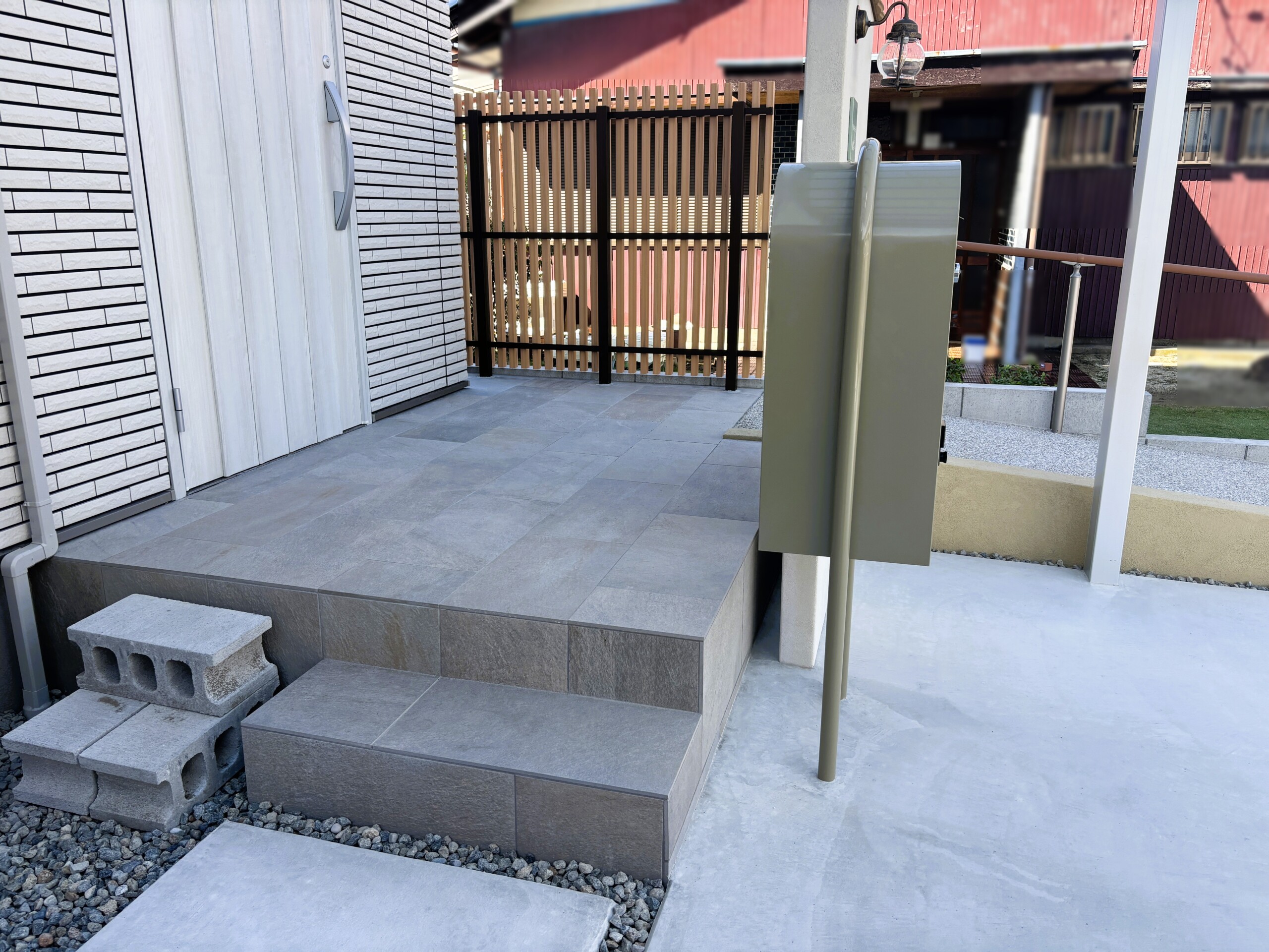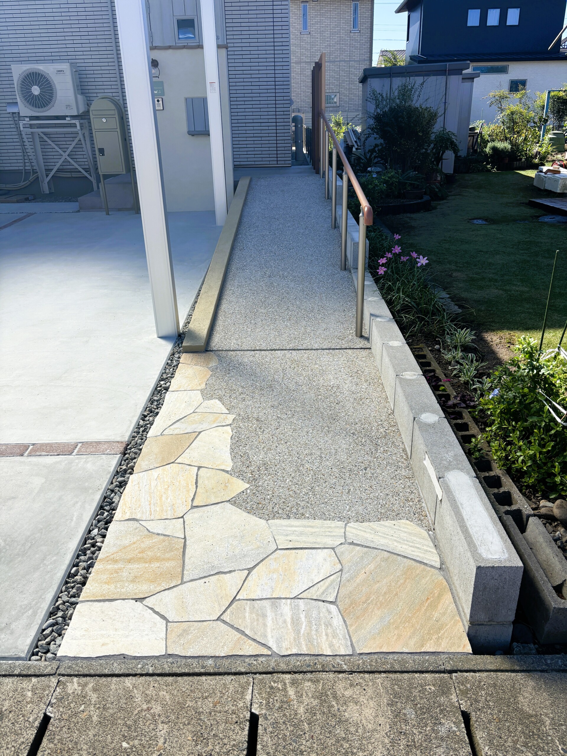 道路側にはカーポート付きの2台用の駐車場と、洗い出しコンクリートでスロープをつくりました。スロープの入り口にはワンポイントで乱形石を張り、側面のブロックは塗装で仕上げて無機質さをなくしています。