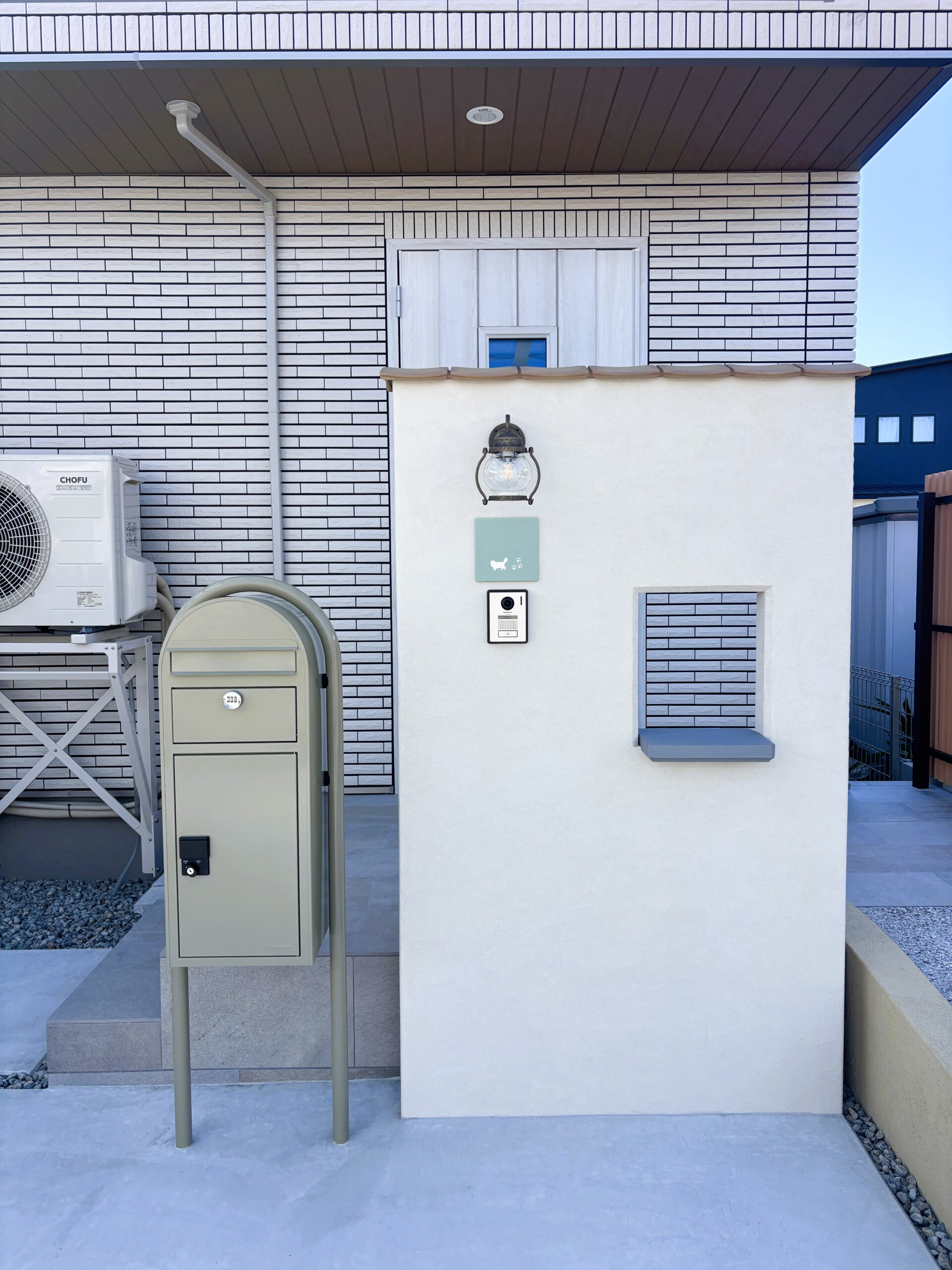 かわいい門壁と北欧デザインの宅配ボックスがある一条工務店の新築外構工事の施工例|扶桑町