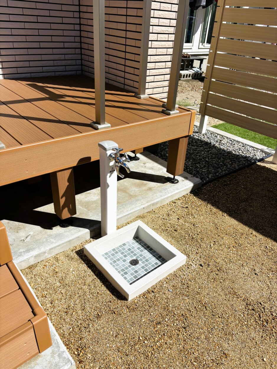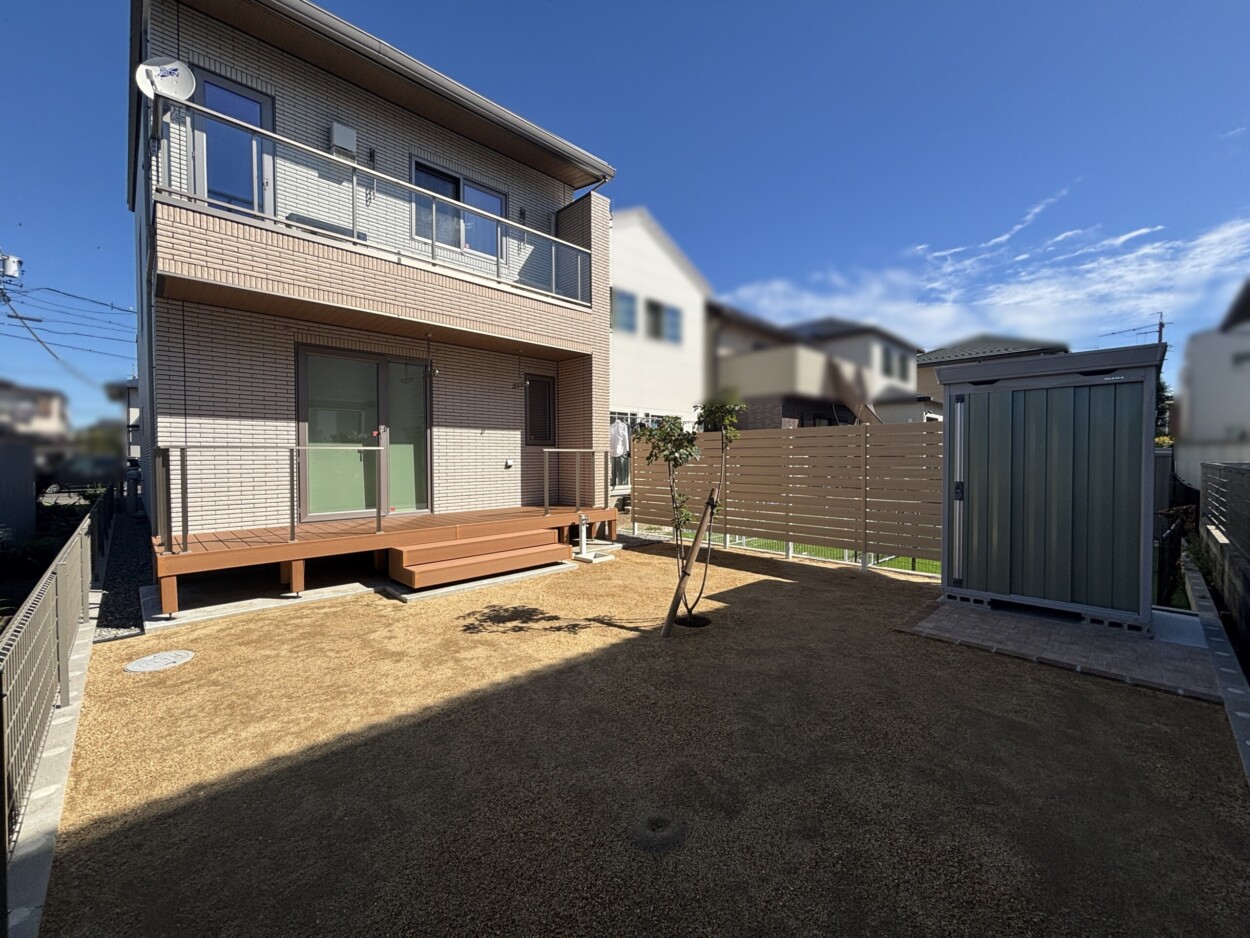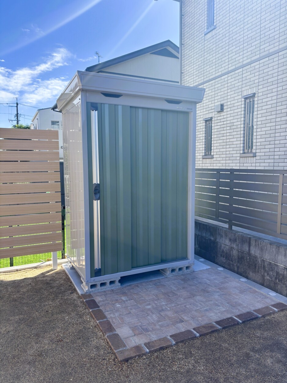 玄関前にはディーズガーデンのルポを門壁として設置して照明や表札を取り付け、ポストと宅配ボックスは壁の横に独立で設置しました。玄関横と自転車用の目隠しには、防犯面を考慮し、隠しすぎない縦格子フェンスを採用しました。駐車場横とお庭の目隠しにはプライベート感をアップさせるため横板フェンスを採用し、隙間は10㎜に設定しています。お庭の中央には観賞用兼目隠し用にスモークツリーを植えました。低木や草花はお施主様ご自身で植えられる予定ですが、お庭が建物裏で大きい木を運ぶのは大変だろうということで、シンボルツリーの植え込みのみご依頼いただきました。ガーデンニング用品などを収納できる物置も設置しました。コーディネーター 川尻
