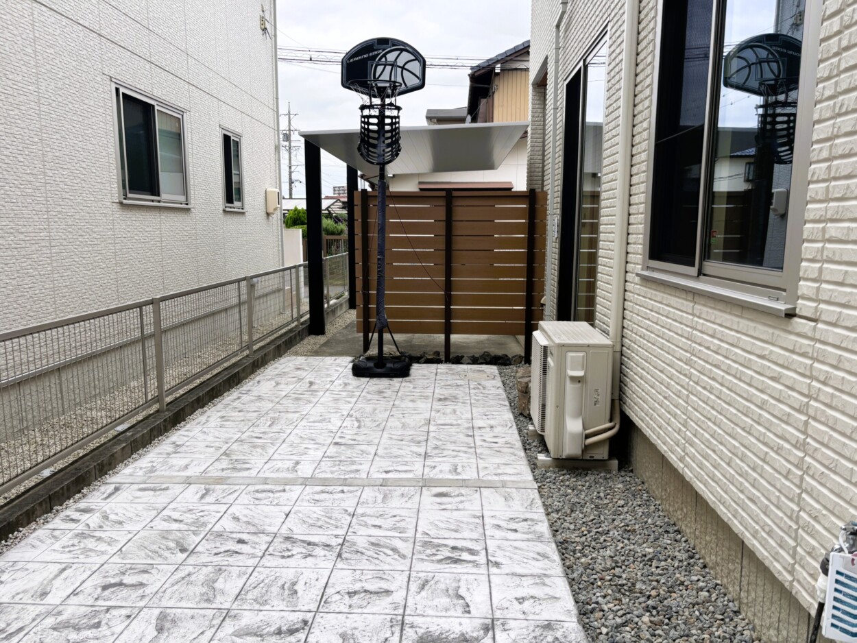 お庭でバスケットボールができるようスタンプコンクリートの舗装とカーポートSC設置のリフォームの施工例|扶桑町