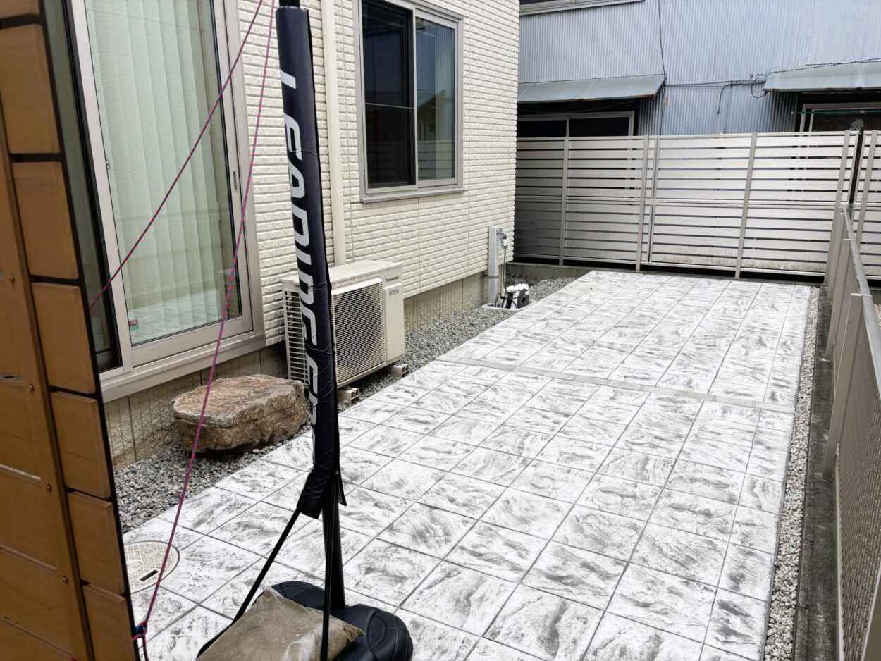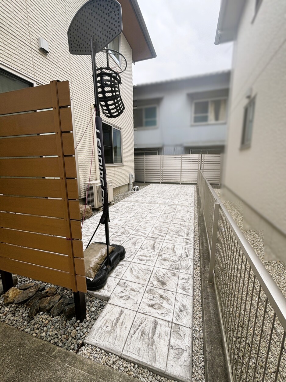 お子さんがお庭でバスケットボールをされるということで、ボールが跳ねても土が飛んだりへこんだりしないよう、コンクリートで舗装したいとご相談をいただきました。ただのコンクリートではせっかくのお庭が無機質になってしまうので、色やデザインの種類が豊富なスタンプコンクリートをご提案させていただき、白+グレーの色で300角のタイル調のデザインが採用となりました。