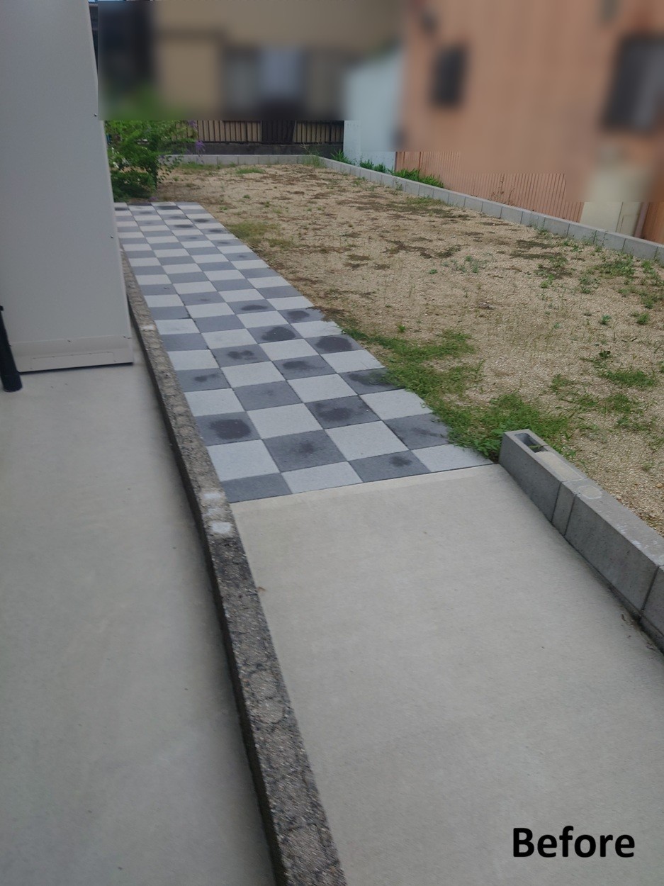 以前、当店に外構工事をご依頼いただきましたお客様からのご依頼です。前回施工しなかったお庭の部分の部分に雑草が生えたり元々あった庭木が大きくなって管理が大変ということで庭のリフォームをご依頼いただきました。雑草対策として平板敷きや人工芝張り、防草シート+砂利敷きで雑草が生えるような土の部分を大幅になくしました。平板敷きは雨水が地面に浸透する透水性の平板を採用し雨水対策も万全です。一部花壇を作り最小限の土の部分は残してありますので好きなお花を植えることが出来ます。大きくなった庭木は撤去して本数を減らしました。すべてを撤去するのではなくポイントで残して再利用すると視覚的な癒しと目隠し効果もあるので良いと思います。