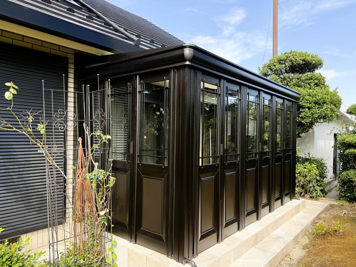お庭でのんびり過ごすための素敵なガーデンルームとアイアンでつくった階段の手すり設置の施工例|稲沢市